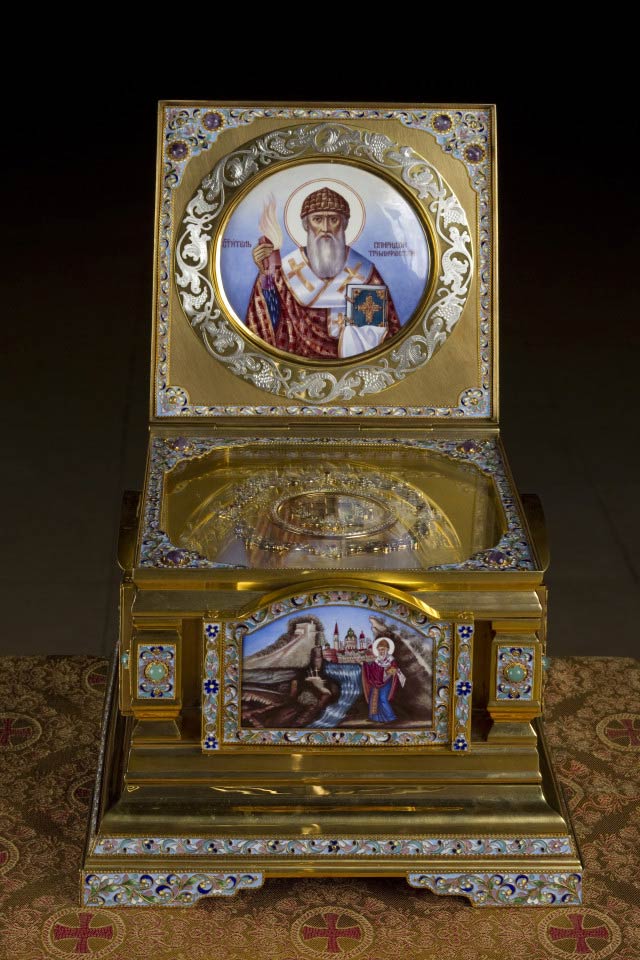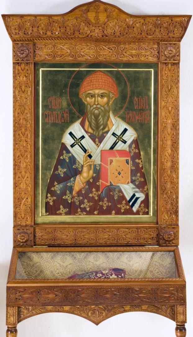 О, всеблаже́нне святи́телю Спиридо́не, вели́кий уго́дниче Христо́в и пресла́вный чудотво́рче! Предстоя́й на Небеси́ Престо́лу Бо́жию с ли́ки А́нгел, при́зри ми́лостивым о́ком на предстоя́щия зде лю́ди и прося́щия си́льныя твоея́ по́мощи. Умоли́ благоутро́бие Человеколю́бца Бо́га, да не осу́дит нас по беззако́ниим на́шим, но да сотвори́т с на́ми по ми́лости Свое́й! Испроси́ нам у Христа́ и Бо́га на́шего ми́рное и безмяте́жное житие́, здра́вие душе́вное и теле́сное, земли́ благопло́дие и во всем вся́кое изоби́лие и благоде́нствие, и да не во зло обрати́м блага́я, да́руемая нам от ще́драго Бо́га, но во сла́ву Его́ и в прославле́ние твоего́ заступле́ния! Изба́ви всех ве́рою несумне́нною к Бо́гу приходя́щих от вся́ких бед душе́вных и теле́сных, от всех томле́ний и диа́вольских наве́тов! Бу́ди печа́льным уте́шитель, неду́гующим врач, в напа́стех помо́щник, наги́м покрови́тель, вдови́цам засту́пник, си́рым защи́тник, младе́нцем пита́тель, ста́рым укрепи́тель, стра́нствующим путево́ждь, пла́вающим ко́рмчий и исхода́тайствуй всем кре́пкия по́мощи твоея́ тре́бующим вся, я́же ко спасе́нию, поле́зная! Я́ко да твои́ми моли́твами наставля́еми и соблюда́еми, дости́гнем в ве́чный поко́й и ку́пно с тобо́ю просла́вим Бо́га, в Тро́ице Святе́й сла́вимаго, Отца́ и Сы́на и Свята́го Ду́ха, ны́не, и при́сно и во ве́ки веко́в. Ами́нь.
